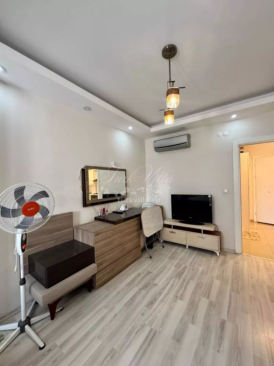 Планировка включает светлую гостиную с кухней открытого типа, одну спальню, санузел и балкон. Из окон открывается приятный вид на горы. В каждой комнате установлены кондиционеры, а также предусмотрено газовое отопление, что делает квартиру комфортной для круглогодичного проживания.